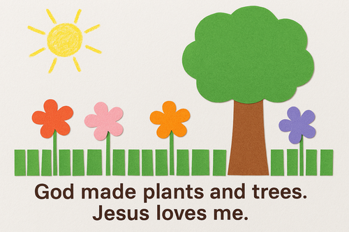 “Jesus is God’s Son. The Bible tells us that everything was made through Jesus. Jesus helped make the grass, the flowers, and the tall trees. Jesus gives us food from plants, and He shows us how much God cares for us. When we see plants and trees, we can remember that Jesus made a beautiful world and loves us.”