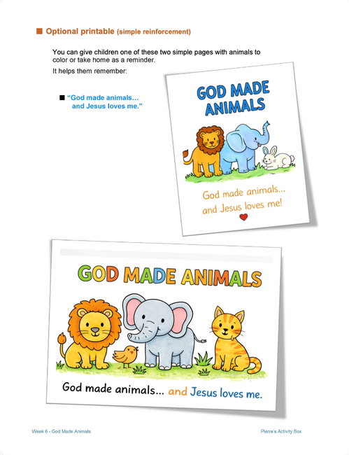 Repeat: “God made animals. Jesus loves me.”