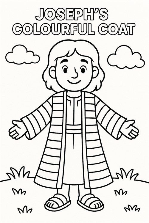 - Table: coloring page of Joseph with a colorful coat and crayons.