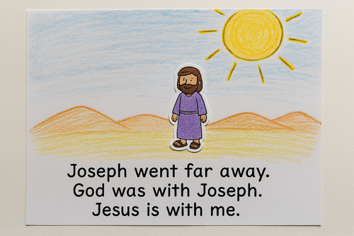 - “In your picture, Joseph is far from home. He had to go to a new place. That was hard, but God did not leave him. God was with Joseph far away. Jesus is with you wherever you go—home, church, daycare, school, a trip—Jesus stays with you and loves you.”
