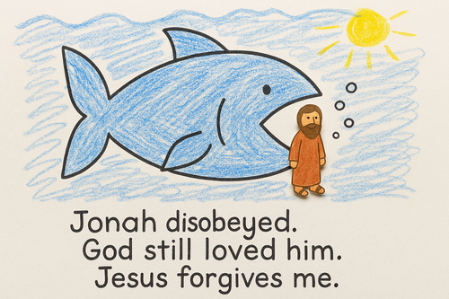 - “Your picture shows Jonah and the big fish. Jonah did not obey God at first, but God still loved him. God kept Jonah safe in the fish and gave him another chance. Jesus loves us and forgives us when we disobey and say sorry. We can remember: ‘Jonah disobeyed. God still loved him. Jesus forgives me.’”