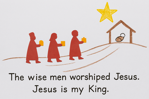 - “Your picture shows the wise men following the star to Jesus. When they found Him, they worshiped Him and gave Him gifts. We can’t bring Jesus gold, but we can give Him our love and praise. When you look at this picture, remember: ‘The wise men worshiped Jesus. Jesus is my King.’”