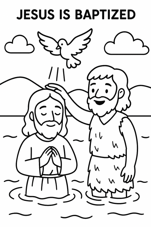 - Table: coloring page of Jesus standing in the water with John and a dove above, plus crayons.