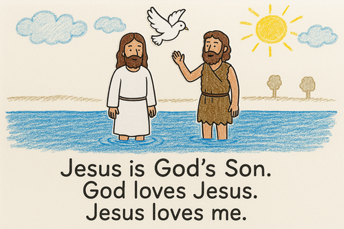 - “Your picture shows Jesus standing in the water with John and the Holy Spirit coming down like a dove. God said, ‘This is My Son, I love Him.’ Jesus is God’s Son, and He loves you too. When you look at this picture, remember: ‘Jesus is God’s Son. God loves Jesus. Jesus loves me.’”