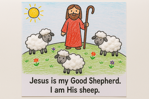 - “Your picture shows Jesus the shepherd with His sheep. Jesus cares for His sheep, keeps them safe, and leads them. Jesus is your Good Shepherd. You are one of His sheep. When you look at this picture, remember: ‘Jesus is my Good Shepherd. I am His sheep.’”