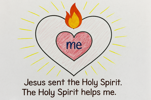 - “Your picture shows a heart with a little flame above it. The flame reminds us of the day the Holy Spirit came to Jesus’ friends. The Holy Spirit is our Helper. He lives with us and helps us love and follow Jesus. When you see this picture, remember: ‘Jesus sent the Holy Spirit. The Holy Spirit helps me.’”